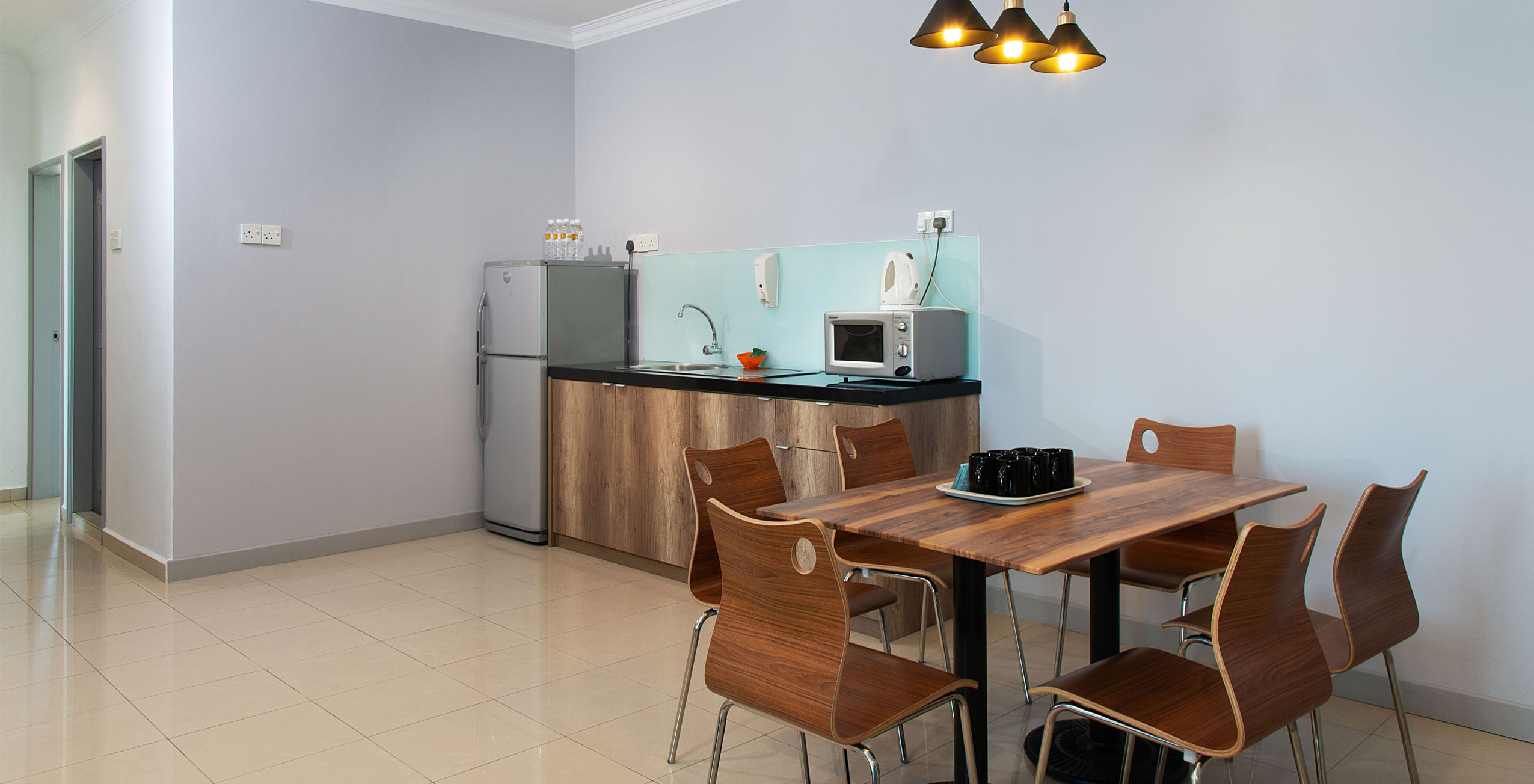 - Dapur kecil dilengkapi dengan meja makan beserta kursi makan, kulkas, microwave, teko untuk membuat teh dan kopi, peralatan makan dan perkakas dapur.